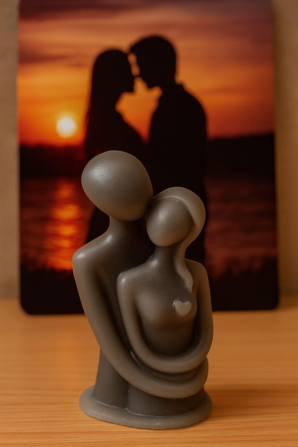 Evlerinize sıcaklık ve zarafet katan bu özel dekoratif kokulu mum, romantik bir atmosfer yaratmak için ideal bir seçim. Detaylı kabartmalı tasarımıyla birbirine sarılmış âşık çift figürü, her yanışta huzurlu ve etkileyici bir ambiyans sunar.