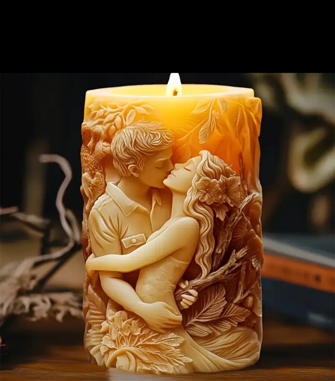 Evlerinize sıcaklık ve zarafet katan bu özel dekoratif kokulu mum, romantik bir atmosfer yaratmak için ideal bir seçim. Detaylı kabartmalı tasarımıyla birbirine sarılmış âşık çift figürü, her yanışta huzurlu ve etkileyici bir ambiyans sunar.